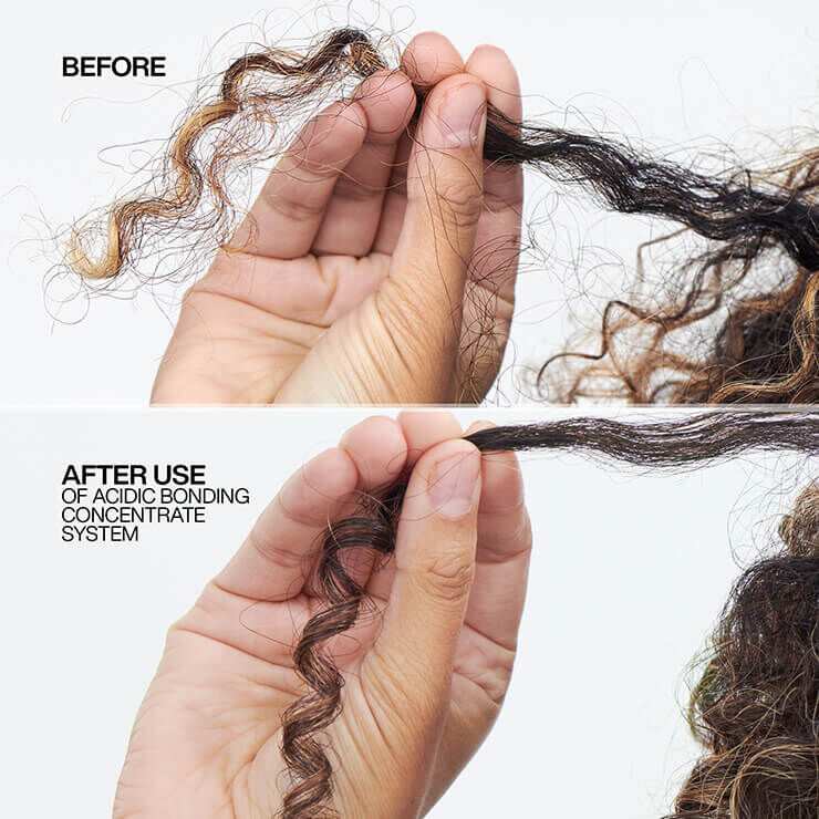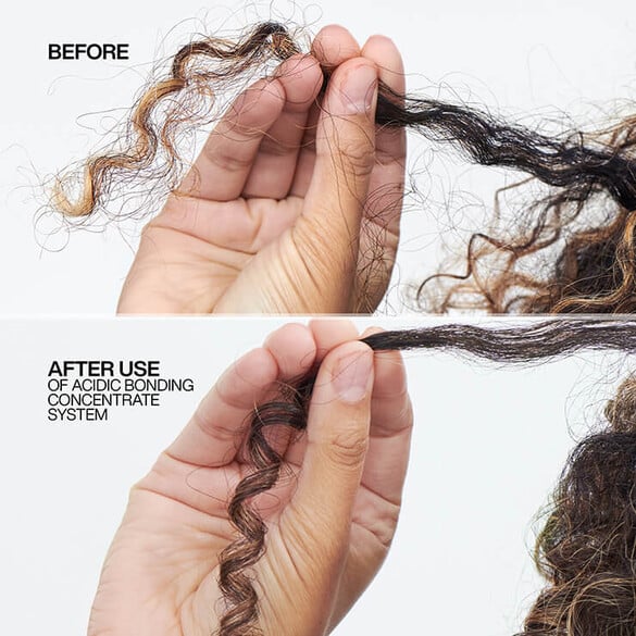 Redken's Bonding Care Complex + Citric Acid works at a molecular level and penetrates the cuticle capturing metal ions, reinforcing weakened bonds and improving hair strength.